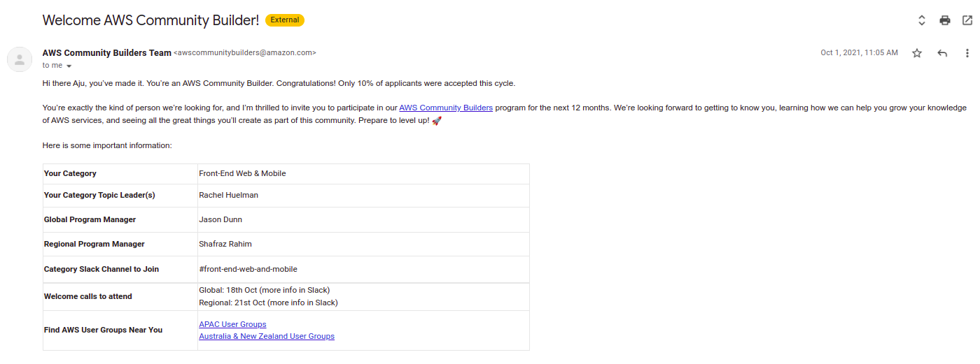 I couldn’t bear my happiness at that moment, I often refresh my browser’s tab multiple times to ensure it was delivered to my mail, or I became a hallucination. I replied to the mail for this opportunity and quickly for a few moments, I even got the response. Thanks to Shafraz Rahim and Jason Dunn. OMG, that was the best feeling I have ever got so far. Now, I am officially AWS Community Builder. This was the journey of how I got into AWS Community Builder.