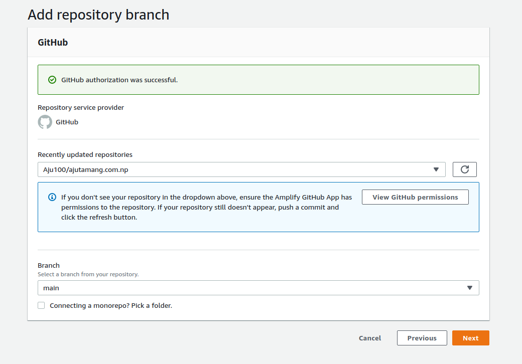 - First, connect your centralized code repository. E.g., Github, BitBucket, GitLab. You will need to allow AWS Amplify to communicate with it. Here, I clicked to connect the GitHub account and give permission to access my project.