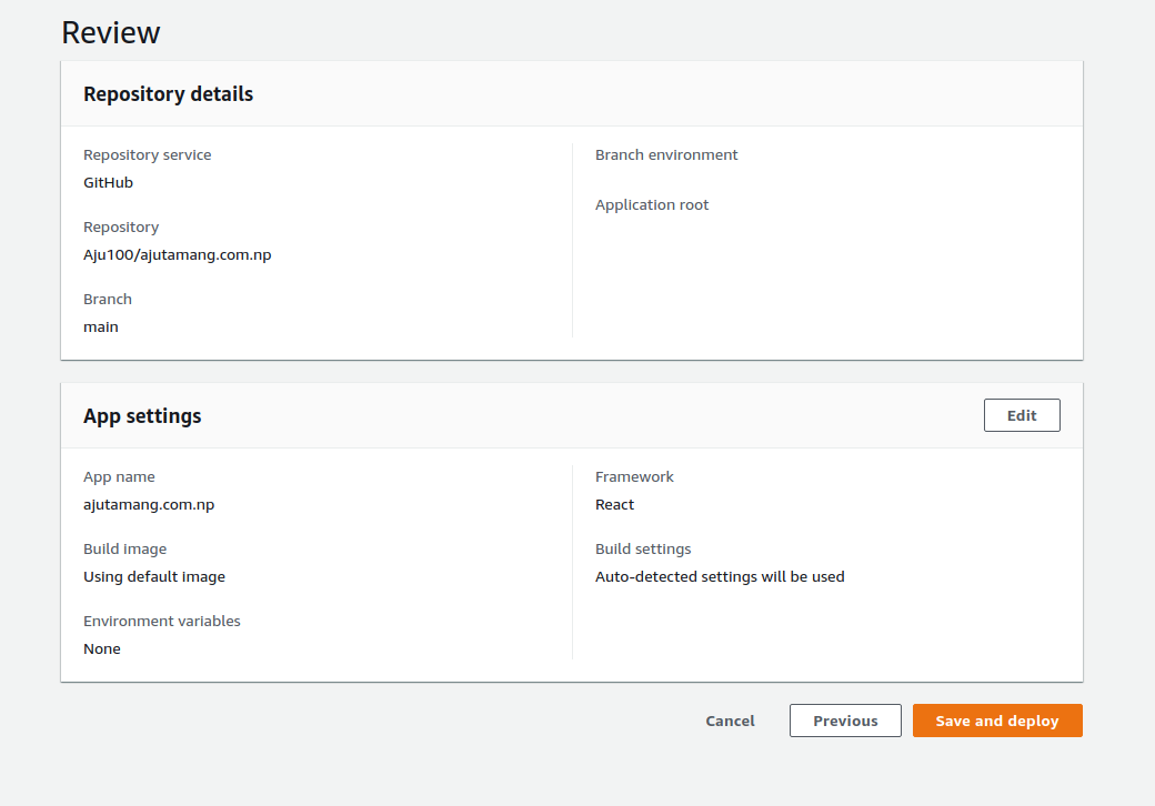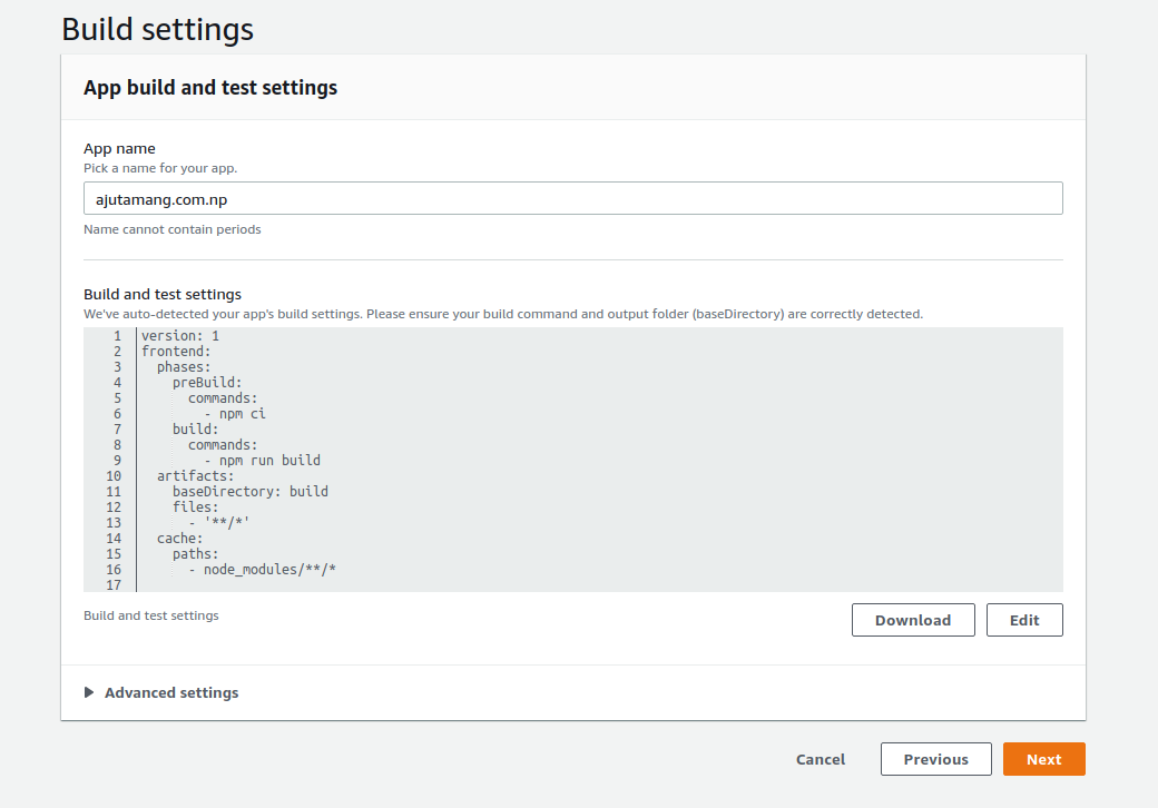 As soon as the branch is selected, AWS Amplify detects the frontend framework that you’ve used. It will then suggest suitable build settings for you.