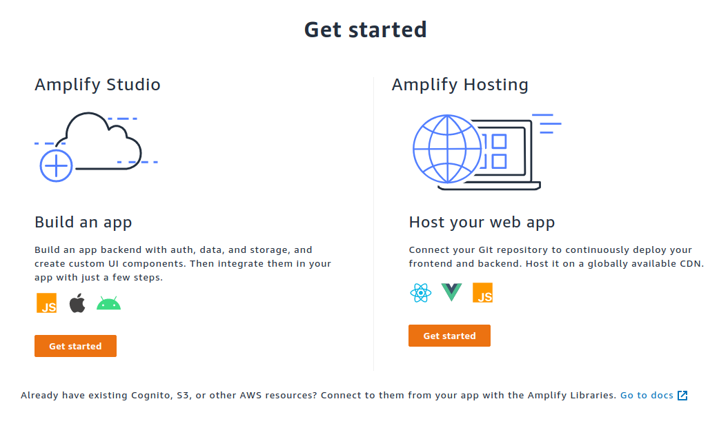 - Once you get logged into your AWS Amplify console, click “Get started”. It scrolls down to the “Get started” section at Amplify Hosting.