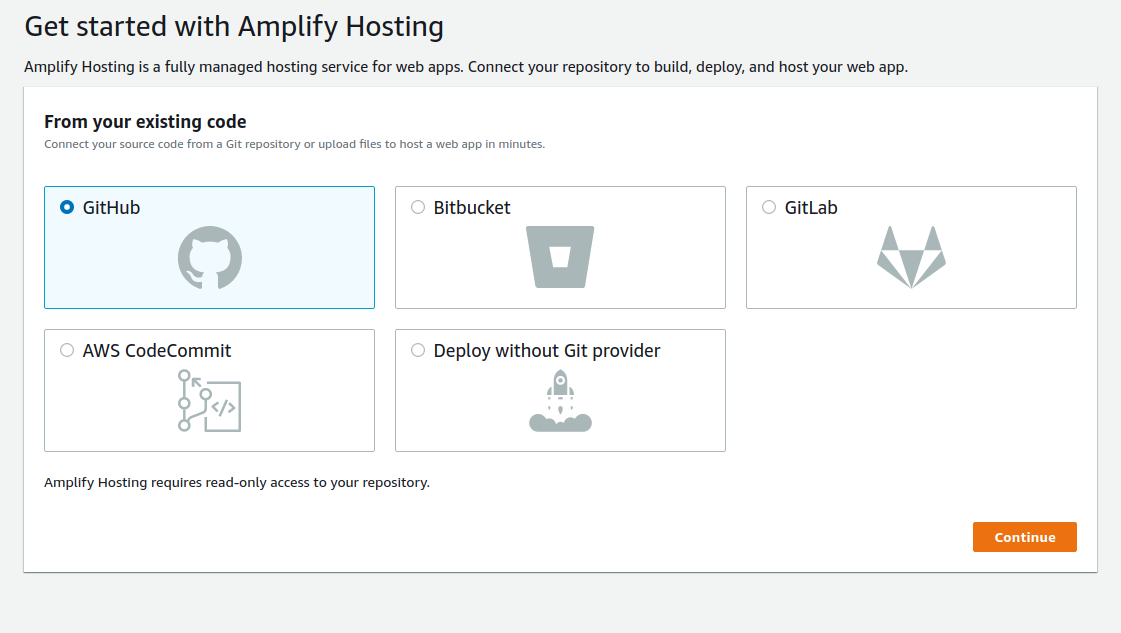 We choose Amplify Hosting at this moment as it should be according to our requirements. It will take you to the page where you can host your own React or any other application . You can connect the source code from the Git repository (or) if you don’t have any code. You can also scroll down and click “Continue” in the form full-stack samples option.